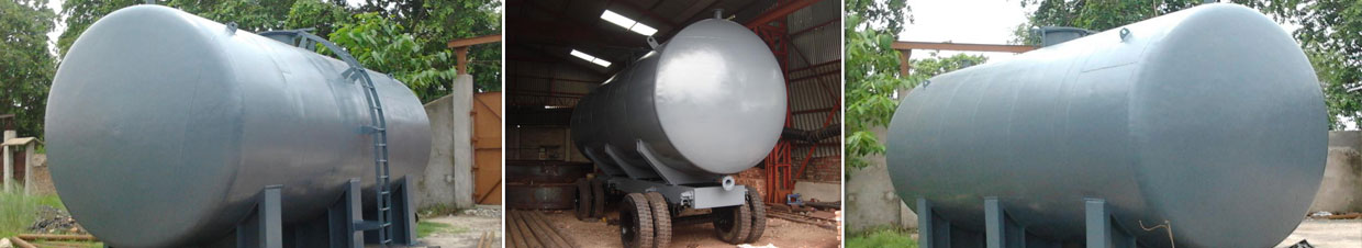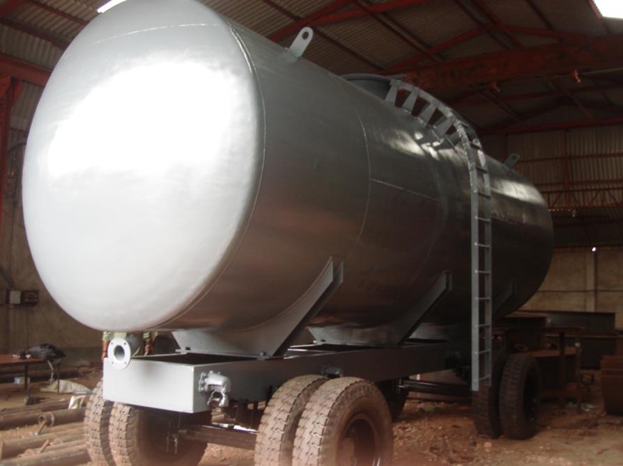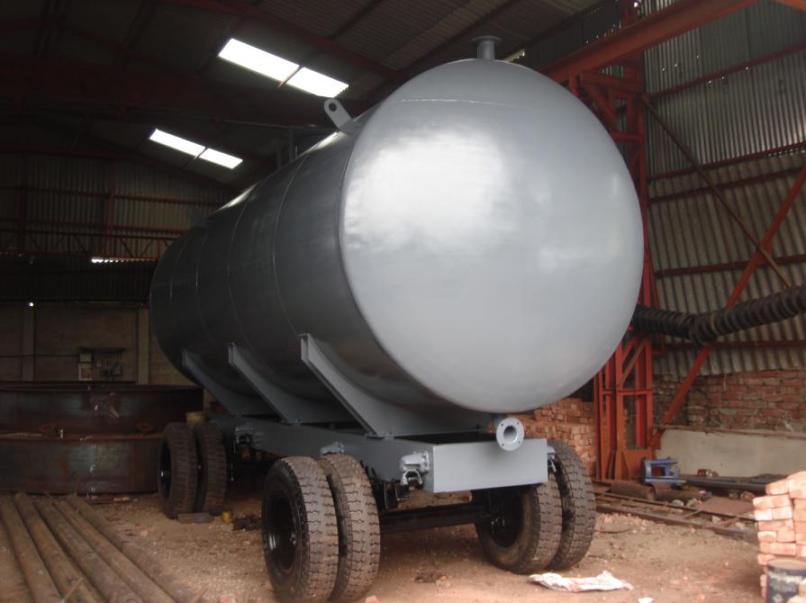 We have Design / Manufactured & Supplied Trolley Mounted & Ground Mounted Transformer Tank Capacity 25Kl for the Storage of Transformer Oil for the Maintenance of Transformer. It is towable having eight (08) nos. of pneumatic tyres of suitable size for resting on Four (04) nos. of suitable jacking pads for supporting the empty / loaded tank resting on the ground without tyres. The tank will be fabricated with adequately designed M.S Plate welded seamlessly and will have welded dish ends. The tank shall be primarily resting on two saddles and the saddles shall be mounted on a chassis. The chassis shall be resting on two axles connected through leaf springs and rocker links without . Braking arrangement Each Axle shall be fitted with four Pneumatic Tyres for supporting the fully loaded tank while on move. One no. suitable Tow-Bar shall be provided at one side of the Tank for connecting to the Towing truck.
